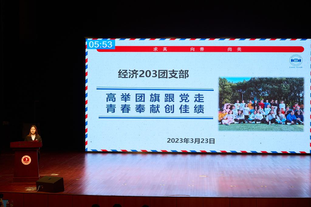 经济203团支部、国经国际201团支部入围答辩,他们分别从班团建设、学习科研、活动开展、志愿实践等方面展示支部特色成果。