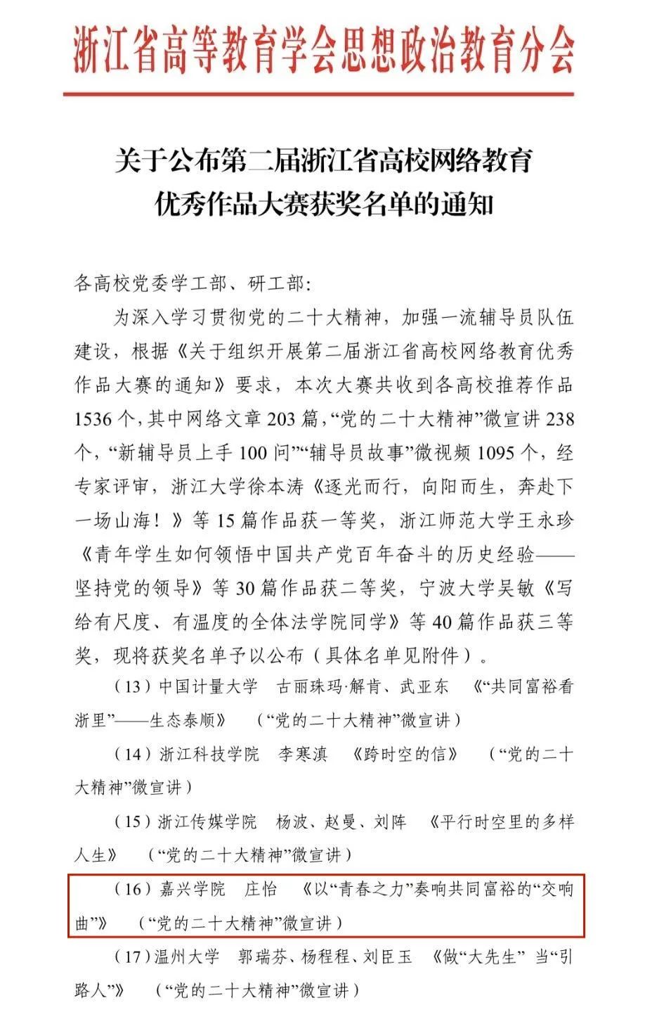 近日,浙江省高等教育学会思想政治教育分会公布了第二届浙江省高校网络教育优秀作品大赛获奖名单,飘花电影 辅导员庄怡提交的“党的二十大精神”微宣讲作品《以“青春之力”奏响共同富裕的交响曲》荣获二等奖。