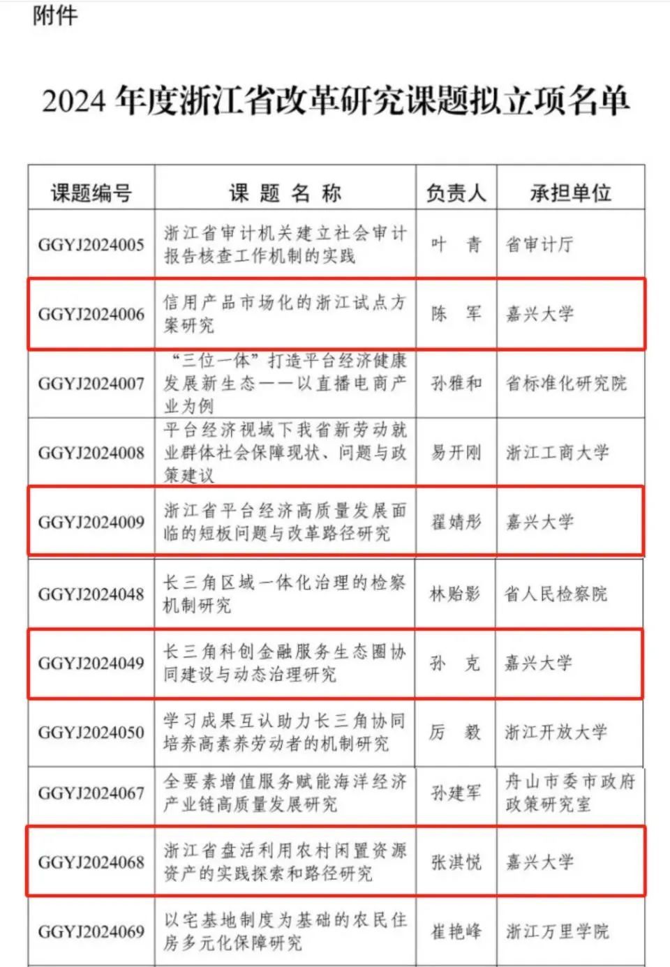近日,中共浙江省委全面深化改革委员会办公室公布了《2024年度浙江省改革研究课题拟立项名单》。飘花电影 陈军教授主持的课题《信用产品市场化的浙江试点方案研究》、翟婧彤博士主持的课题《浙江省平台经济高质量发展面临的短板问题与改革路径研究》、孙克教授主持的课题《长三角科创金融服务生态圈协调建设与动态治理研究》、张淇悦博士主持的课题《浙江省盘活利用农村闲置资源资产的实践探索和路径研究》获得拟立项。