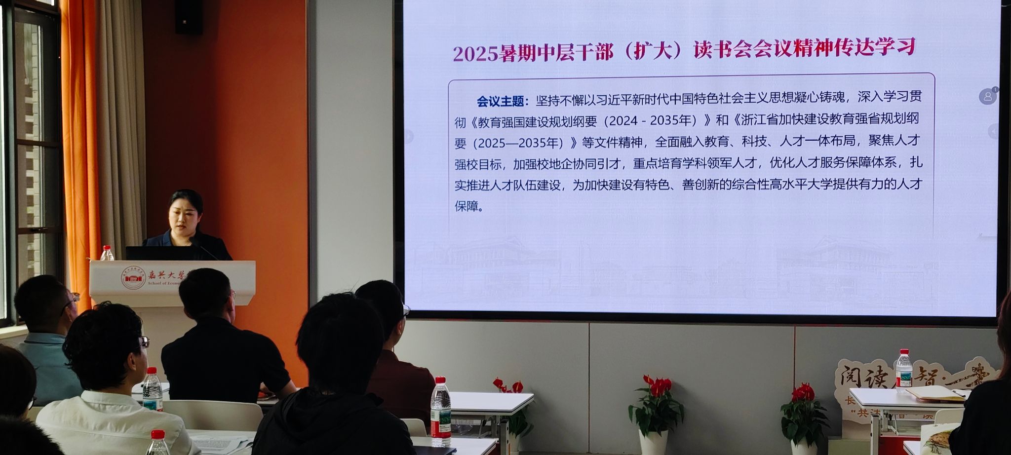 会上,学院党委书记蔡运男传达了2025年学校暑期中层干部(扩大)读书会会议精神。她表示,在学校发展进入关键阶段的大背景下,聚焦人才强校主题意义重大,全院教师要深刻领会人才强校的重大意义,精准把握人才强校的核心要义,齐心合力,锚定学校“冲‘A’、拼‘博’、创一流”的奋斗目标,发挥学院人才队伍的最大效能,有力支持校院跨越发展。