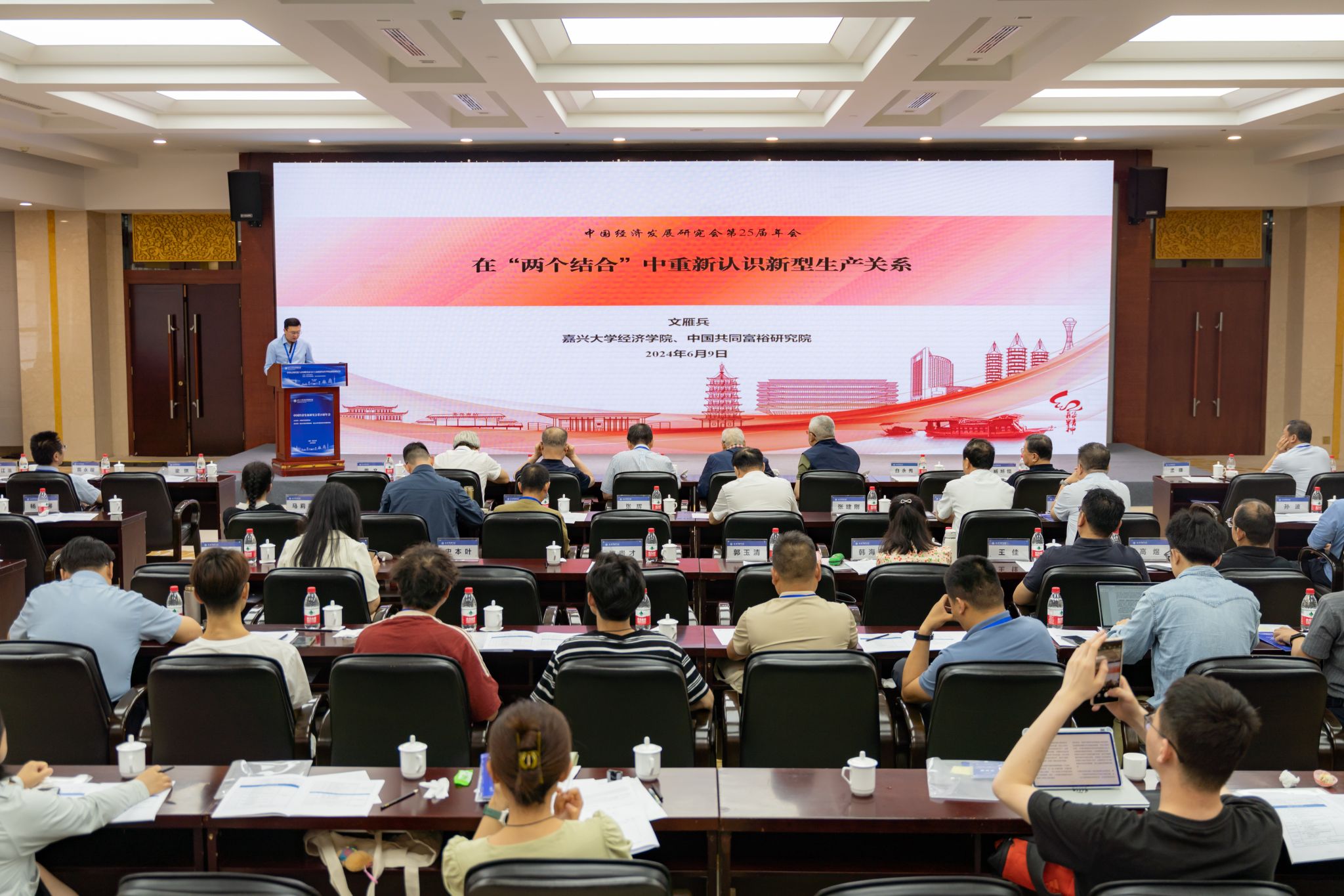 文雁兵教授在6月9日上午做了题为《从“两个结合”的视角中重新认识新型生产关系》的主旨报告。“两个结合”即“把马克思主义基本原理同中国具体实际相结合、同中华优秀传统文化相结合”,是由习近平总书记在庆祝中国共产党成立100周年大会上的重要讲话中明确提出的重大理论观点。他认为,深刻领会“两个结合”的重大意义、科学内涵、内在逻辑和价值旨归,对于构建新型生产关系和发展新质生产力具有重要的启发与指导。发展新质生产力必须构建与之相适应的新型生产关系,才能解决好效率与公平或发展与共享这个经济学核心问题,才能实现可持续的高质量发展,才能更好向现代化目标不断迈进。新型生产关系不仅包括在生产过程中形成社会关系相关的经济制度、经济政策,还包括与普通劳动者和基层老百姓相关的大量、分散、微观、切身的新“做法”,如新的企业制度、新的组织形式、新的劳动关系、新的分配关系、新的福利体系。在“两个结合”发展好新型生产关系的一个重要路径是构建组织或区域多方利益联结机制,形成持续的内生发展动力,实现发展或者改革目标。