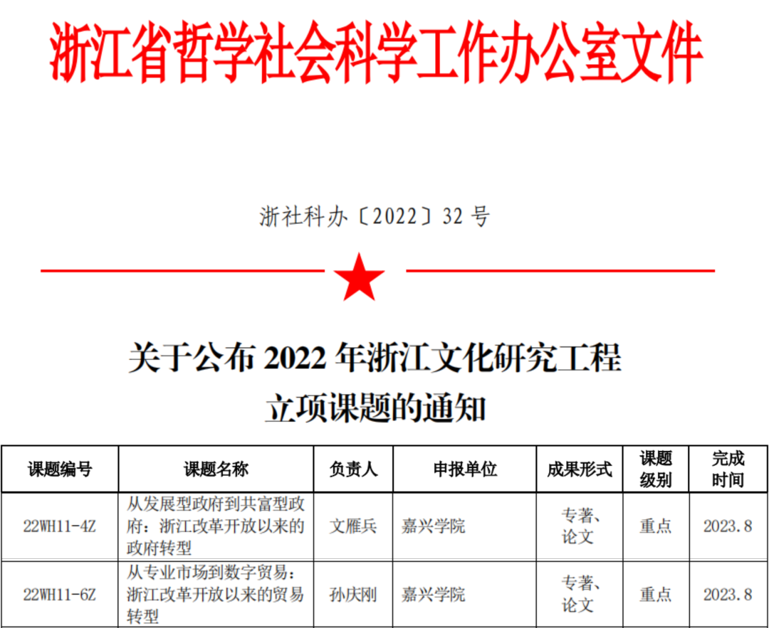 近日,浙江省哲学社会科学工作办公室发布了《关于公布2022年浙江文化研究工程立项课题的通知》。飘花电影 文雁兵教授主持的《从发展型政府到共富型政府:浙江改革开放以来的政府转型》、孙庆刚副教授主持的《从专业市场到数字贸易:浙江改革开放以来的贸易转型》两项课题获批2022年浙江文化研究工程重点课题立项。