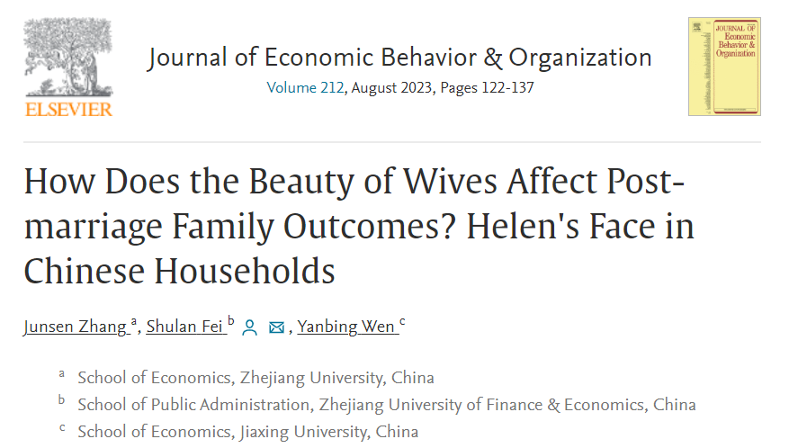 引文:Junsen Zhang, Shulan Fei, Yanbing Wen. How Does the Beauty of Wives Affect Post-marriage Family Outcomes? Helen's Face in Chinese Households[J]. Journal of Economic Behavior & Organization,Vol. 212, 2023, pp: 122-137.