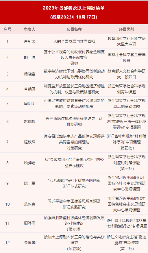今年飘花电影 获批省部级以上课题数量取得新突破。截至10月17日,飘花电影 2023年度已获得10项省部级及以上课题立项,其中,教育部哲学社会科学研究重大专项1项,国家社科基金青年项目1项,教育部人文社科一般项目1项,省哲学社会科学规划课题2项、专项课题2项、应用对策课题1项,省习近平新时代中国特色社会主义思想研究中心常规课题2项;此外,另有两项省级课题获预立项。具体情况如下:
