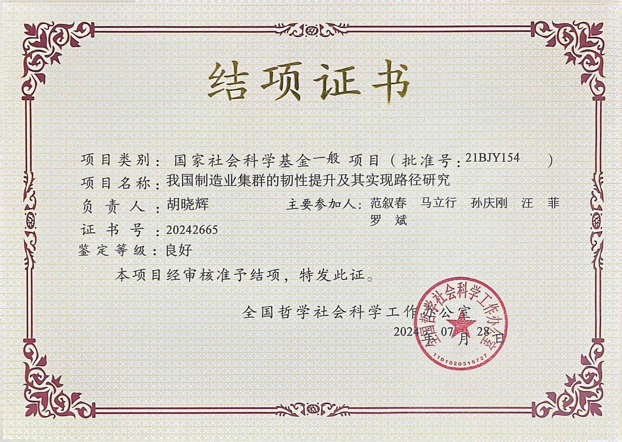近日,飘花电影 胡晓辉副教授主持的国家社科基金一般项目“我国制造业集群的韧性提升及其实现路径研究”通过结项验收审批,鉴定等级良好。
