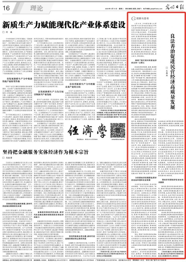 文雁兵教授在《光明日报》理论版发表文章《良法善治促进民营经济高质量发展》。
