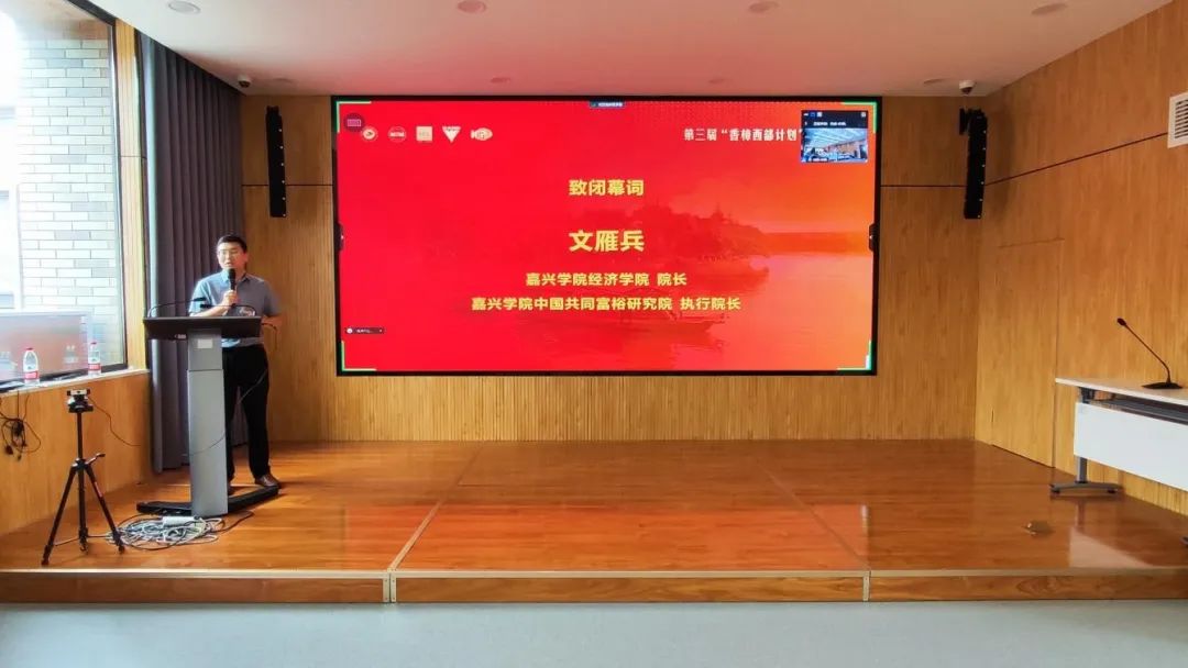 院长文雁兵教授用三个关键词发表了深情致辞。第一个关键词是感谢。首先,感谢香樟经济学术圈和以郑世林老师代表的一批有情怀、有追求、有担当、有理想、有学术志向的国内中青年学者,为众多学子提供了学习与交流平台,走公益性、普惠性、创造性的学术传播与人才培养之路;其次是感谢各位学员的积极配合,使得本届“香樟西部计划”暑期学校圆满成功。其次,感谢嘉兴学院领导、相关职能部门、授课老师等对本次活动线下举行的大力支持和无私帮助。第二个关键词是希望。希望大家通过本届“香樟西部计划”暑期学校的学习、参观和交流,能够在理论知识上有收获、思想理念上有更新、价值观念上有进步,在今后的学术研究上取得更好的成果。同时,希望学员能够将“香樟西部计划”的宗旨和精神传承下去,今后力所能及为中国高等教育发展和为西部地区现代化贡献自己的力量。第三个关键词是邀请。邀请大家多来浙江和嘉兴,对共同富裕、城乡统筹、民营经济、社会治理、教育均衡、数字经济、对外开放等经济社会发展热点问题进行深入调查研究,把研究做在祖国大地,把论文写在祖国大地,把成果应用到祖国大地。
