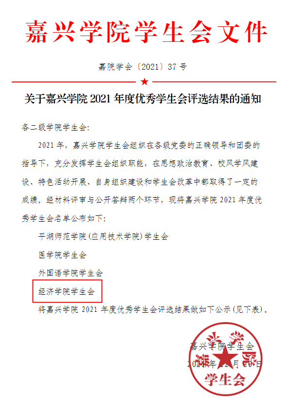 近日,在嘉兴学院2021年度优秀学生会评选中,经材料评审与公开答辩两个环节,飘花电影 学生会被评为“嘉兴学院2021年度优秀学生会”。