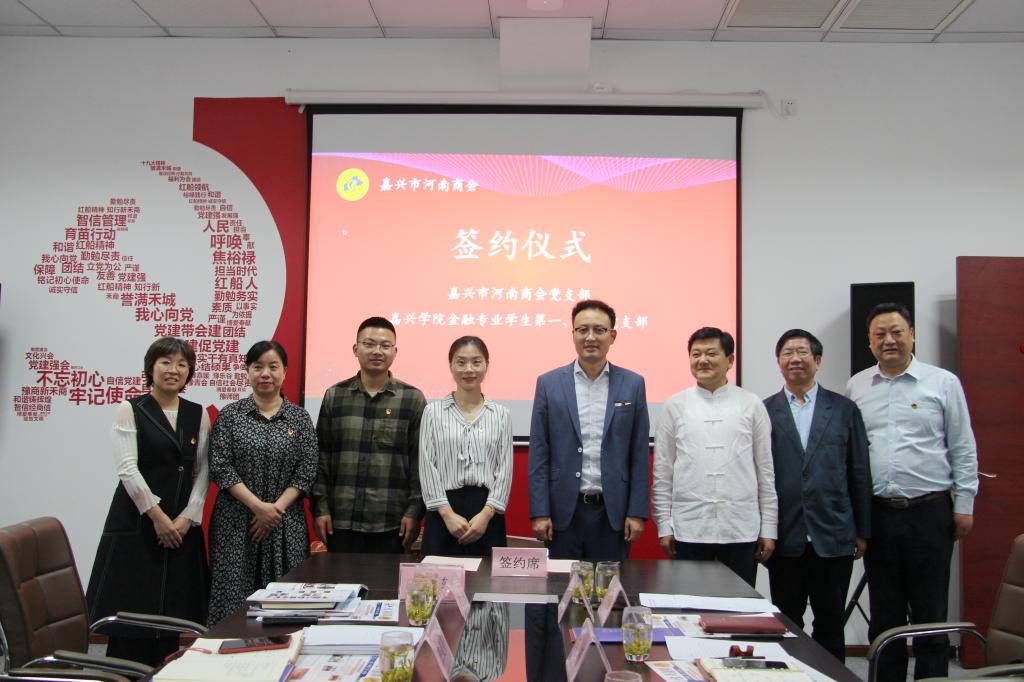 金融专业学生第一、第二党支部与嘉兴市河南商会党支部举行结对签约仪式,共同打造“校会企”党建工作新模式。嘉兴市河南商会会长李永宪,商会副会长、党支部书记吕丹,飘花电影