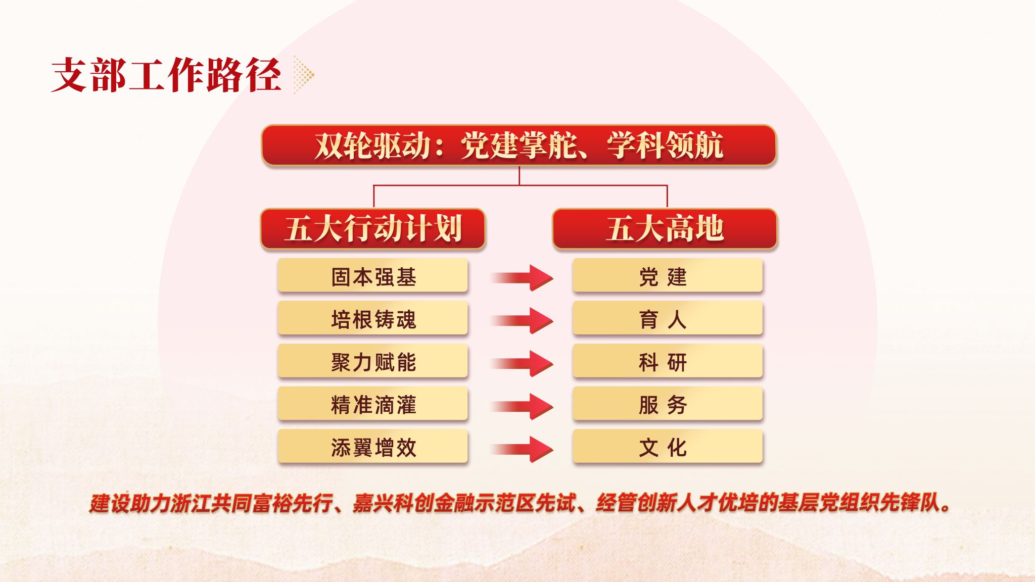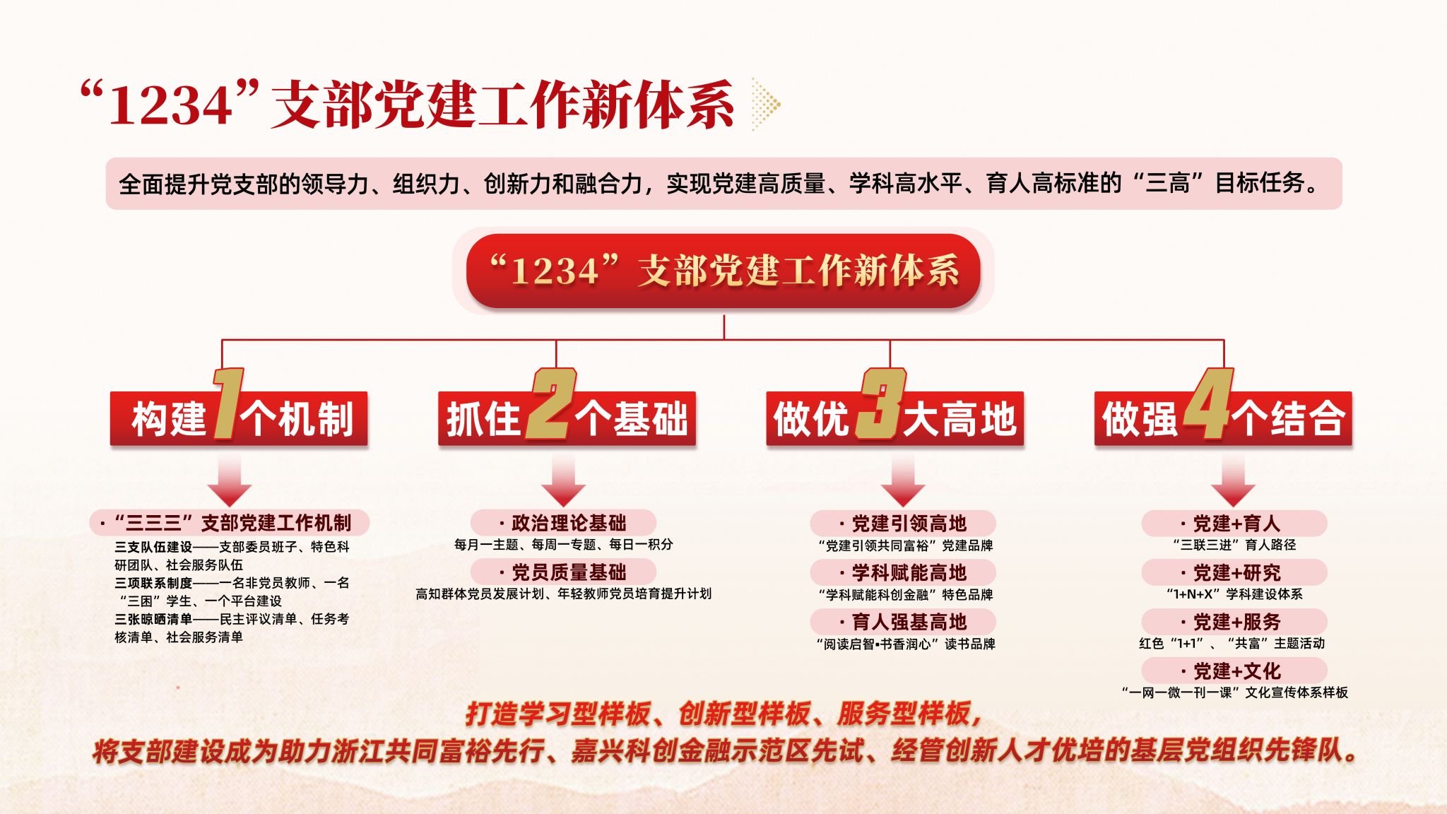 固本强基,发挥堡垒作用更加有力。支部规范落实“三三三”工作机制,细化出台了5项文件制度,通过创新理论交流学、邀请专家辅导学、追随“足迹”现场学、利用网络随时学、以赛促学参与学、党建共建联合学——“六学联动”夯实学习成效,建成“中国共同富裕案例库”,相关成果获学习强国、中国网、光明网、浙江卫视、浙江在线等媒体宣传报道100余次。聚力赋能,推动科学研究更加有力。准对接金融赋能浙江高质量发展建设共同富裕示范区等重大战略需求,共建有嘉兴地方金融发展研究院等5个平台,近年来新增教育部哲学社会科学研究重大专项1项,应用经济学入选省一流学科,累计获省部级及以上领导批示(含正国级)9项,主持国家级课题5项,省部级课题13项,发表CSSCI、SSCI/SCI等核心论文20余篇,横向课题到账经费约950万元。培根铸魂,促进人才培养更加有力。组建省级教学团队,打造“学科思政、专业思政、课程思政”一体化红色金融人才思政体系,《数字经济概论》获批省“十四五”新文科教材,建成课程思政数字化资源库。与嘉兴市金融业联合会等共建“科创金融实习实践基地与创新创业基地”等校企育人平台15个,指导全国“挑战杯”课外科技学术作品竞赛二等奖、三等奖各1项,1名学生获“全国大学生自强之星”称号。